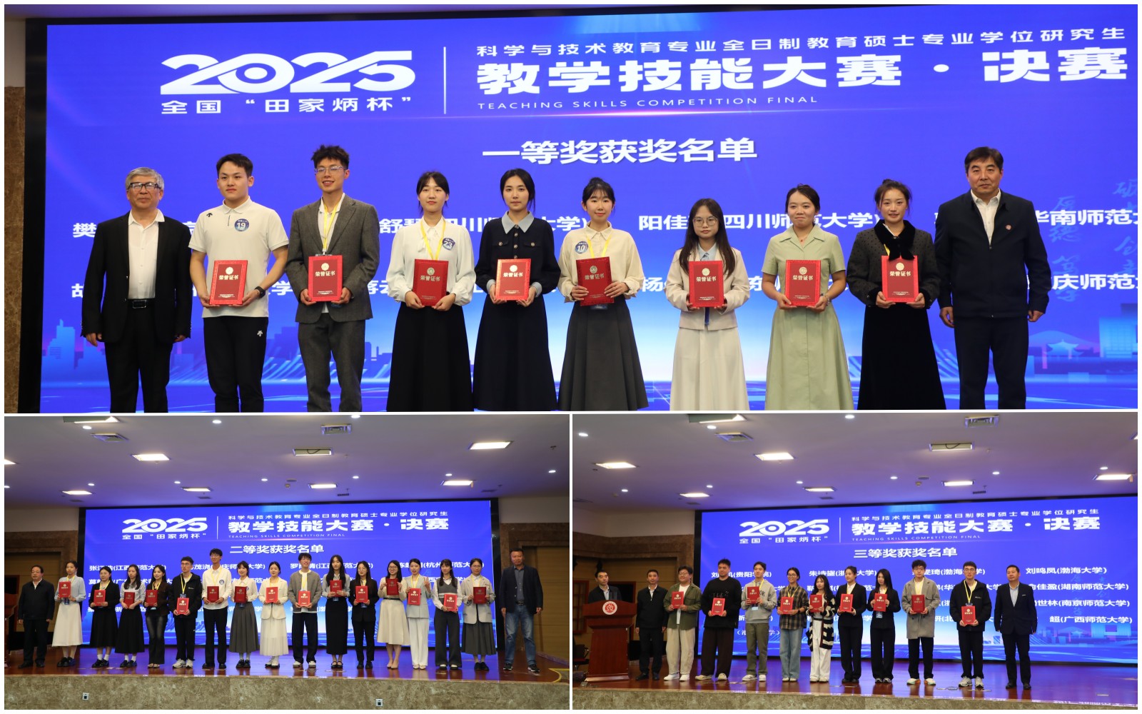 来自北京大学、浙江大学、华中科技大学、北京航空航天大学、华南师范大学、四川师范大学、杭州师范大学、taptap点点体育等35所高校的77名选手在决赛现场同台竞技。赛程涵盖现场抽题、限时备课、模拟授课与专业答辩等环节,全面考核选手在创新实验设计、跨学科教学整合及前沿技术应用等方面的专业素养。选手们在模拟教学场景中充分彰显科学教育面向实践、注重探究的学科特点,通过实验课程设计、科技教学创新等环节,展现了科学与技术教育专业强调动手能力、注重创新思维的鲜明特色。经过激烈角逐以及专家评委严格评审,最终评选出一等奖8名、二等奖15名、三等奖33名及优秀奖20名。与会领导嘉宾为获奖选手颁发了荣誉证书。