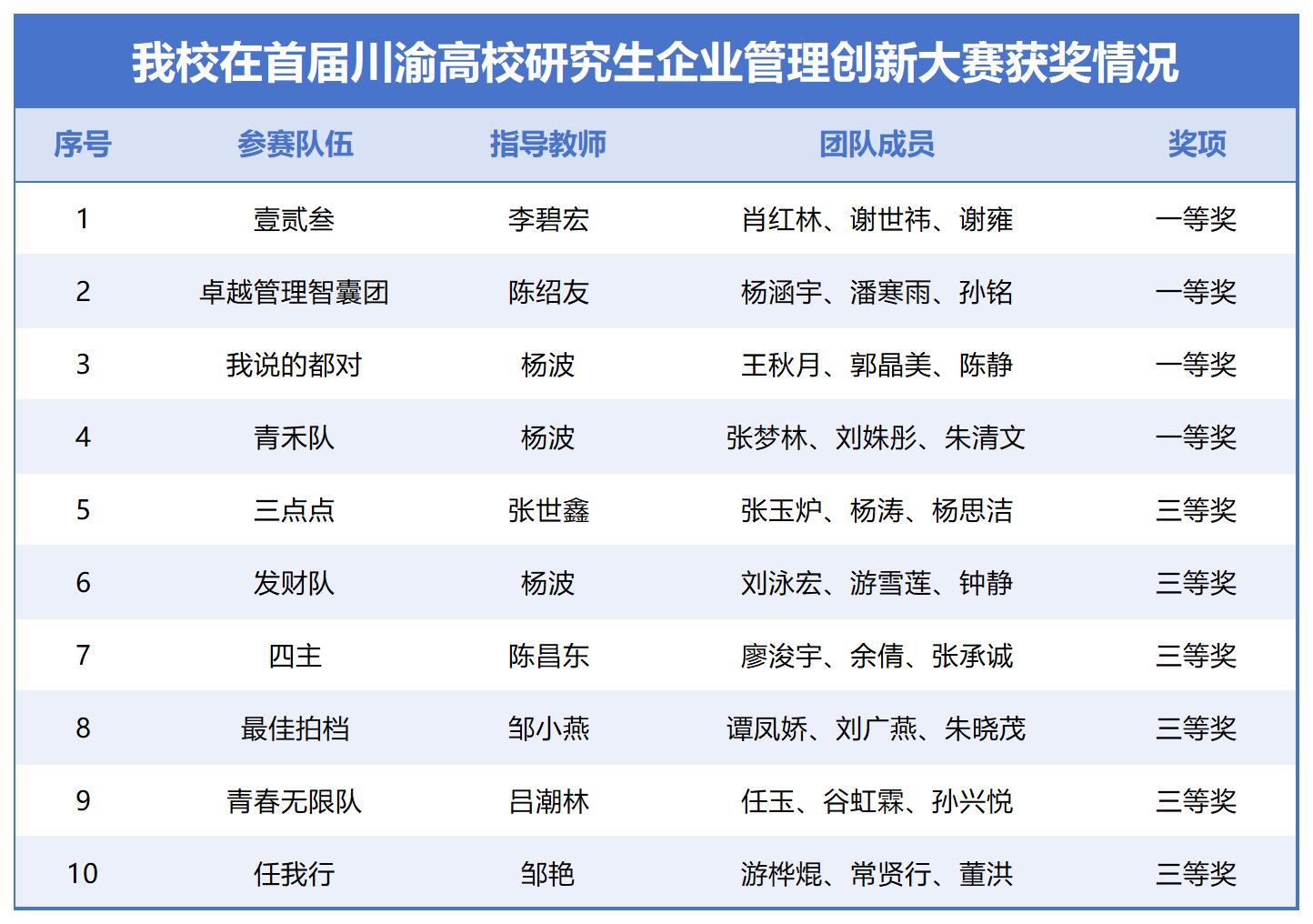 近日,第一届川渝研究生企业管理创新大赛决赛在西南政法大学渝北校区举行。在川渝20所高校140支晋级队伍中,taptap点点经济与管理学院学子获得一等奖4项、三等奖6项,taptap点点荣获“优秀组织奖”。