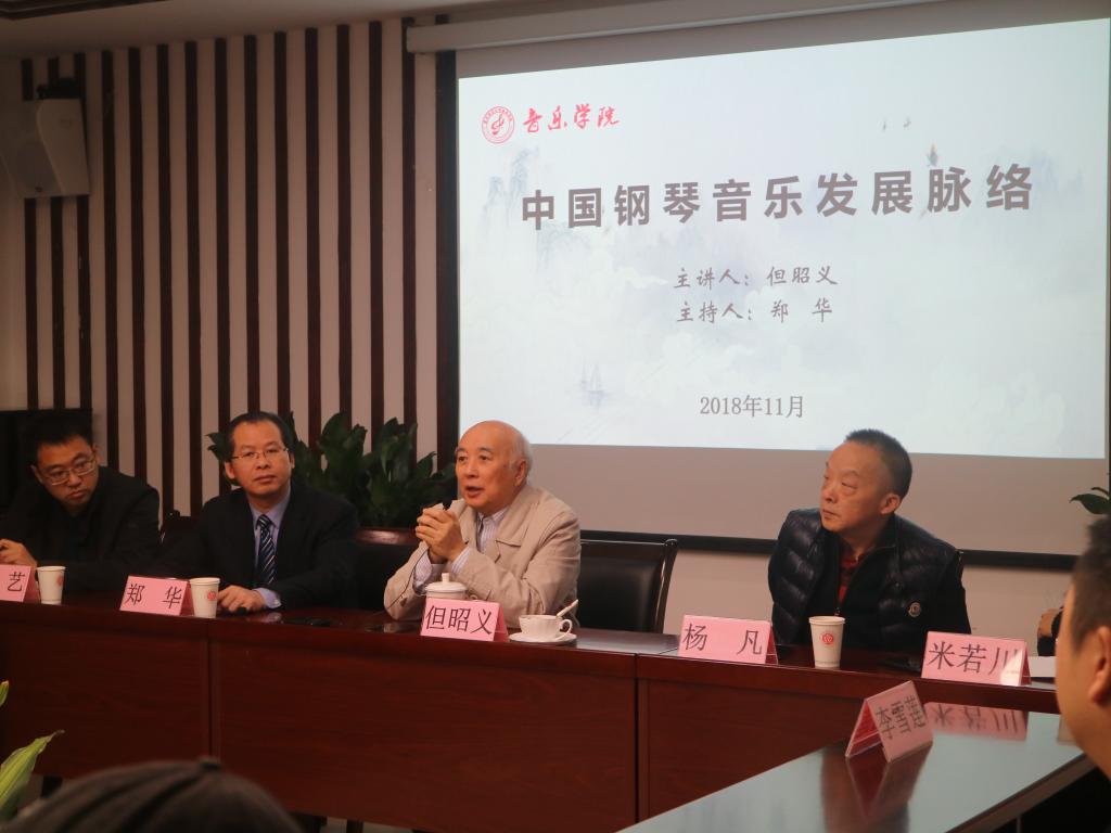 讲座中,但昭义教授谈到从小深受民族音乐的熏陶,立志用钢琴演奏带动民族音乐的发展。他从100年前赵元任先生创作的键盘音乐作品《花八板与湘江浪》讲起,讲述了中国早期、新中国成立之后、”文化大革命“时期、70年代后期和80年代中国钢琴曲创作历程和意义。他提到艺术教育具有启迪思维的作用,音乐则是最贴近人心的艺术。他主张把民族音乐融入到基础教育中去,同时摈弃以前老旧的套路,用新的音乐理念研究基础概念,从而有效促进钢琴教育和钢琴演奏的发展。