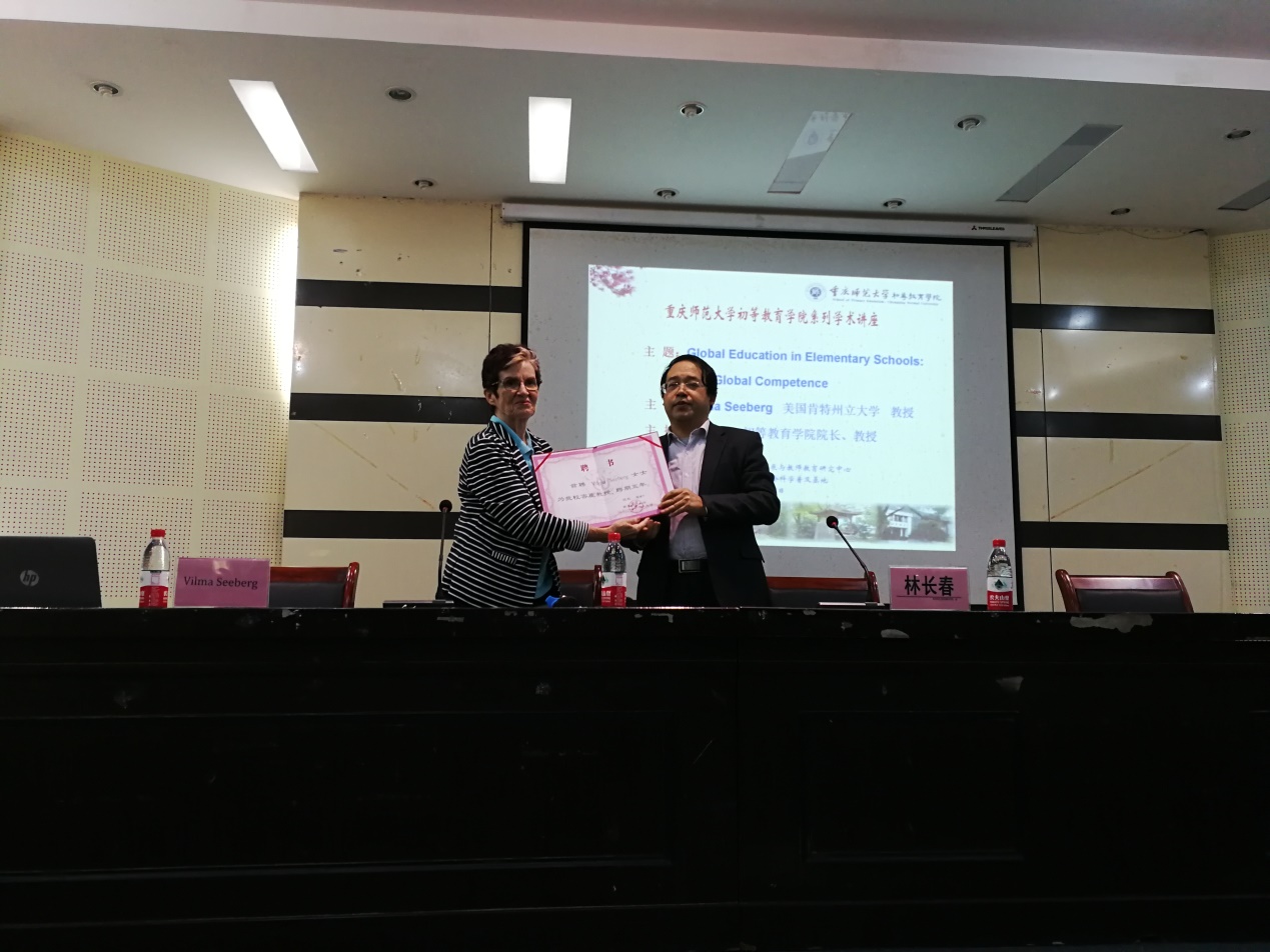 2018年10月10日,美国肯特州立大学教授Vilma Seeberg应邀到taptap点点初等教育学院作题为“小学教育中的全球教育:全球素养”的学术讲座。讲座由重庆市儿童发展与教师教育研究中心和taptap点点体育社科普及基地联合承办,初等教育学院院长林长春教授主持,约200名师生聆听讲座。