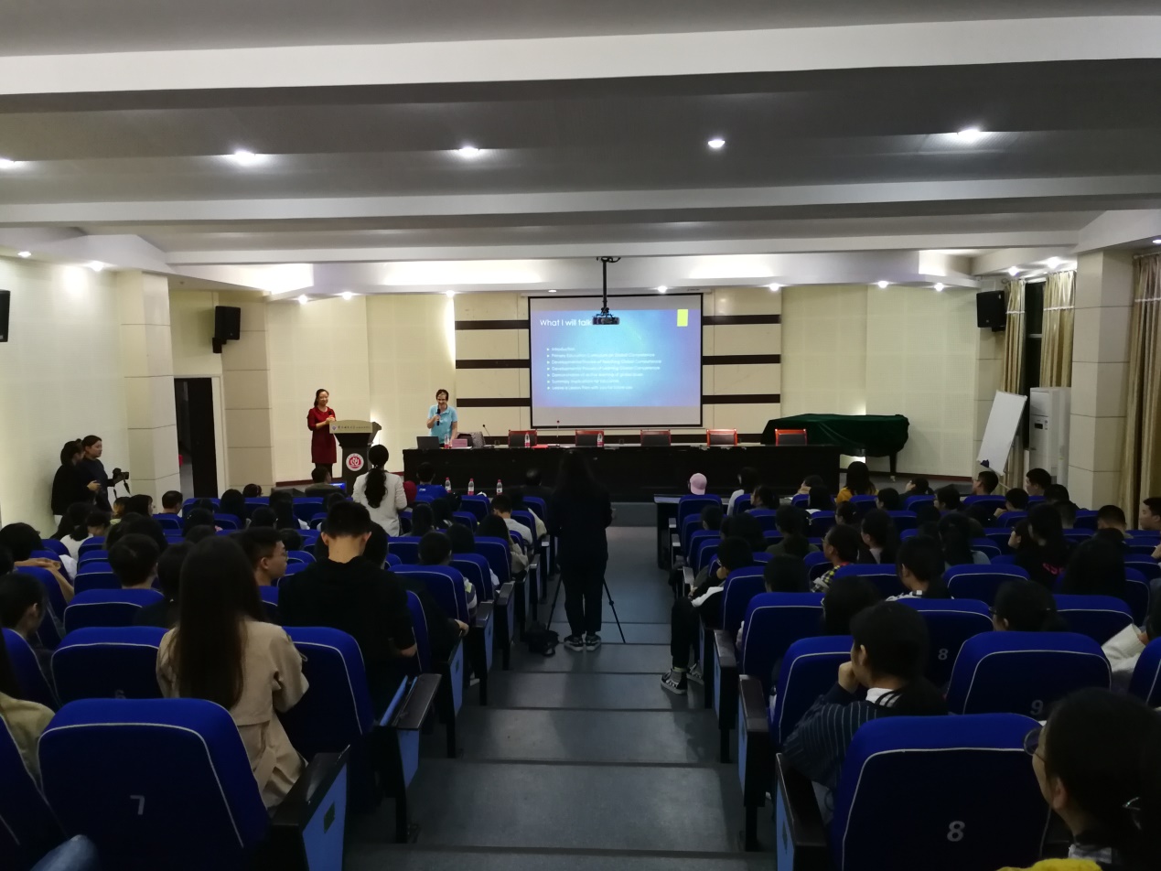 讲座伊始,林长春院长向Vilma Seeberg教授颁发了由周泽扬校长签发的taptap点点体育客座教授聘书。讲座中,Vilma Seeberg教授从小学教育全球化谈起,通过对中美不同教育理念互相影响的现状进行举例,深入分析了全球小学教育形势的变化,提出了在美国小学课程设计中较为盛行的全球素养的教学标准。该标准包括探索世界、认识他人以及他人的观点、交流想法、采取行动去改变世界四个方面。教育者应教导儿童在学习中从认识他们身边做起再到世界再返回到身边,应注重个人倾向对于发展全球素养的重要性,同时也介绍了在全球素养中发展个人倾向的策略,并引用了比较丰富的案例来进行说明。讲座最后,林长春教授总结到,作为小学教育专业师范生,应该从身边实际出发,在学习中建立全球视野,再返回到身边,在自己的生活中做出行动,为成为一名合格教师而努力。