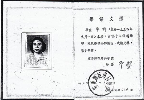 1949年毕业、在小学任教的曾祥瑜得知重庆师专开始招生的消息后,毫不犹豫地放弃当时的工作,考入重庆师专中国语言文学科学系,成为重庆师范专科学校的第一届学生。